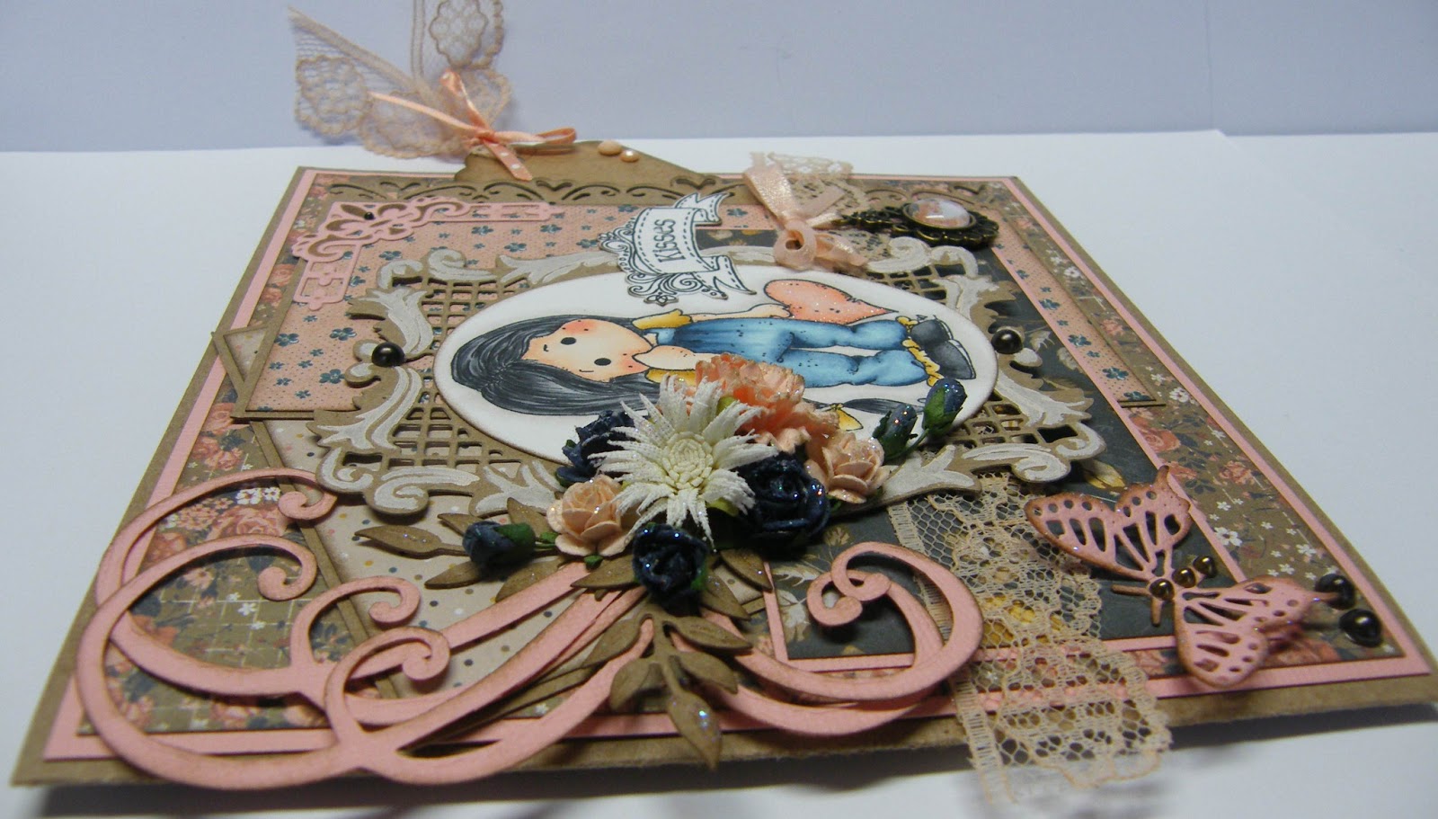Voor dit kaartje heb ik gekozen voor een stempeltje uit de nieuwe serie van Magnolia 'With Love' en dit is 'Lonely Tilda with her Heart'. Ik heb haar ingekleurd met de Copics.
